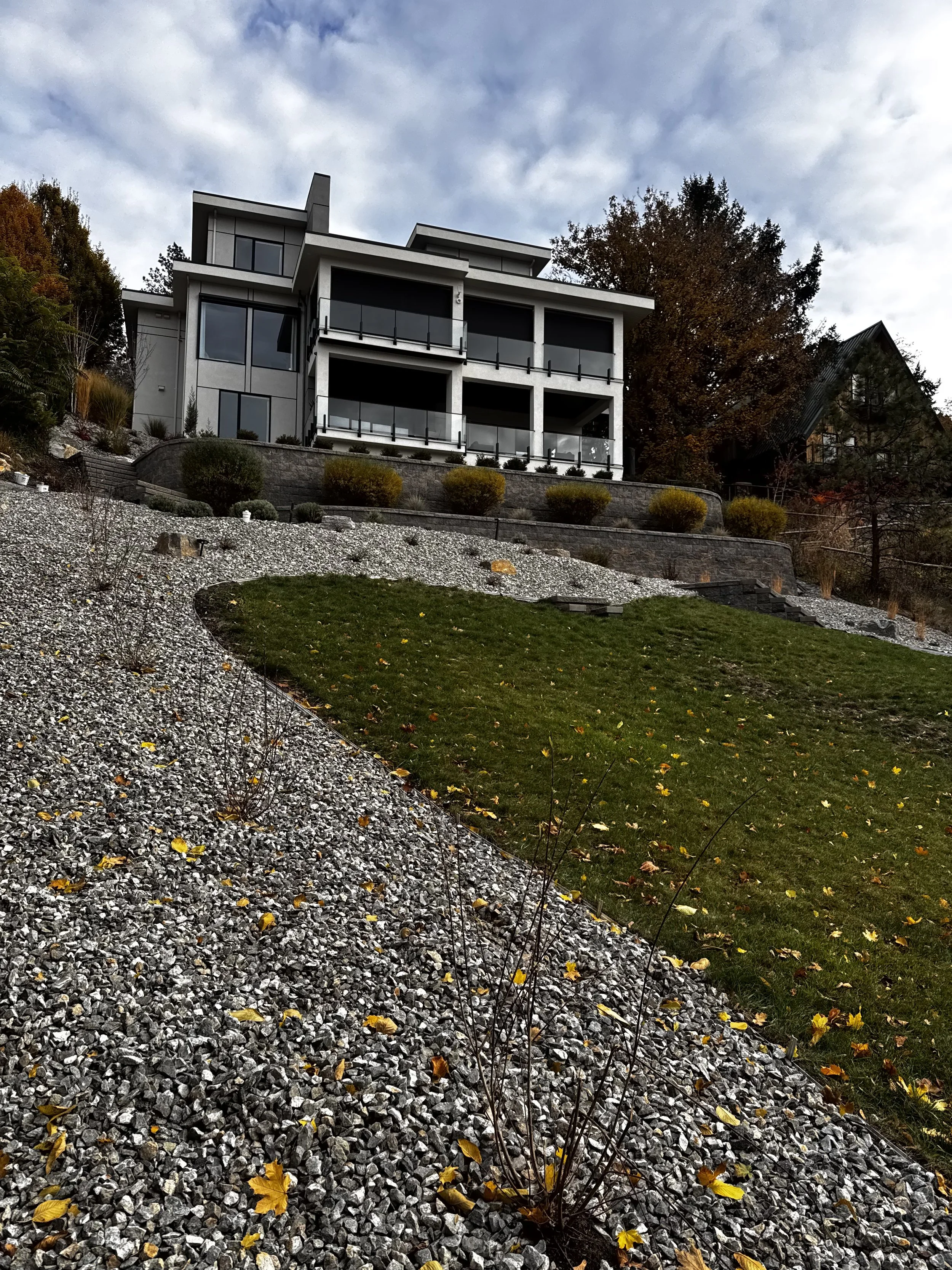 This project built upon a collaborative approach, with an expanded scope that included extensive, custom-engineered retaining walls, a custom outdoor kitchen, a bespoke foot wash station, comprehensive landscape lighting, hydroseeding, and detailed planting throughout the property. Designed to complement the site’s natural topography while enhancing both functionality and visual impact, the landscape balances structure with softness. Carefully integrated lighting highlights key architectural and landscape features, while layered plantings add depth and year-round interest. The result is a cohesive outdoor environment that seamlessly blends form, function, and craftsmanship—reflecting both the client’s vision and Blu-Tec Stoneworks Landscaping’s commitment to thoughtful, enduring design and what matters most.